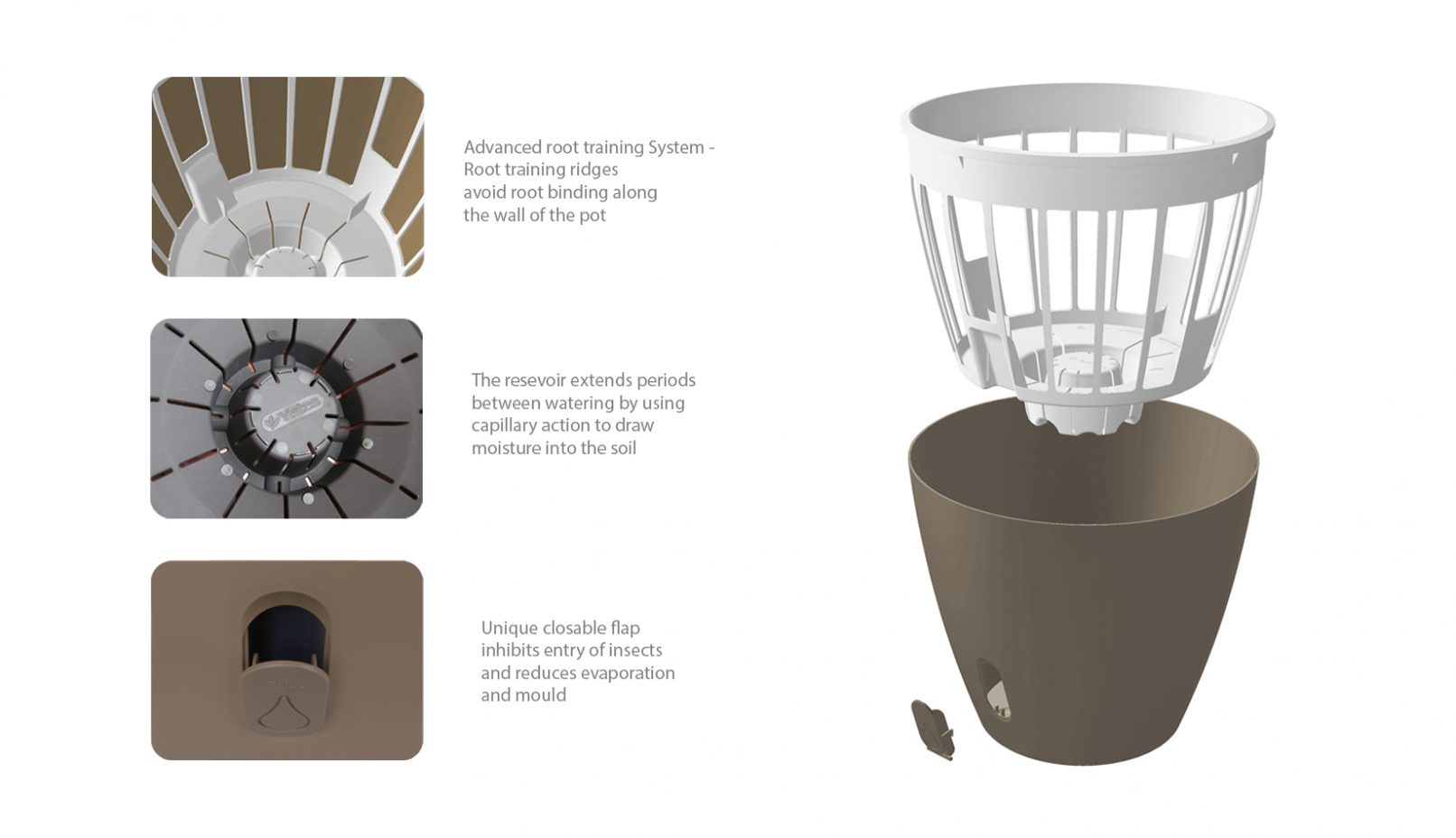 The self watering system has been ergonomically designed to accept all watering cans and hose nozzles. A unique, innovative watering door acts as a water guiding feature when open and seals the pot when closed. The environmental advantage of sealing the water chamber is that it stops evaporation of the water and hence reduces water consumption. This door also has the added advantage of stopping insects entering the pot and degrading the quality of the water.