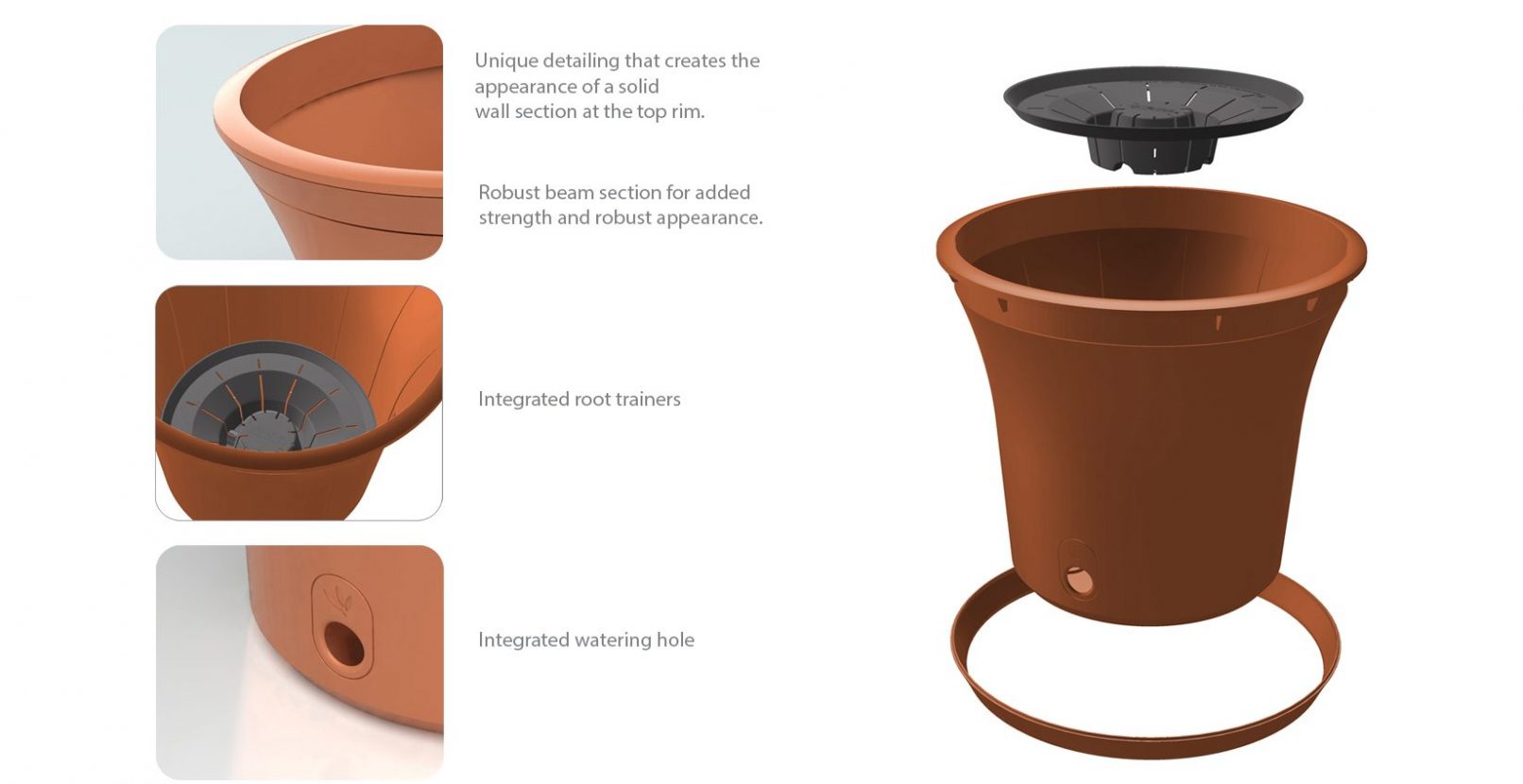 The modern take on classic garden forms gives the range depth and the ability to fit within a variety of household aesthetics for interior or exterior applications. Product-like additions such as the water-spout and integrated root guides takes the range to another level, advancing traditional garden conventions.