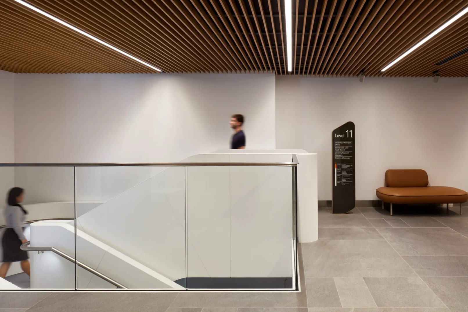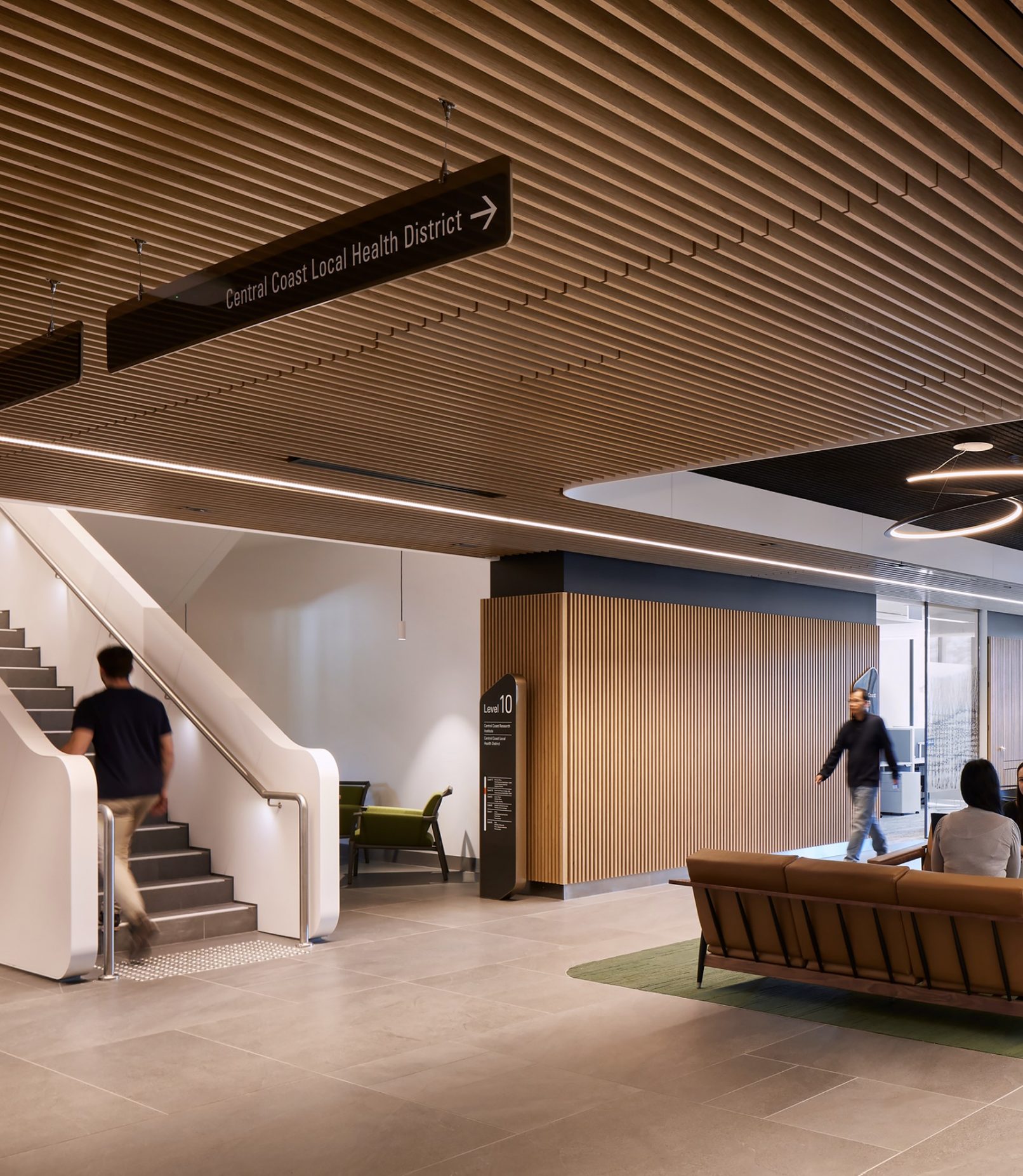 The Central Coast Clinical School and Research Institute in Gosford, designed by DesignInc with wayfinding by Blue Sky, is an 8,000 m² facility that unites education, research and healthcare in a welcoming, people-centred environment. Emphasising collaboration, inclusivity and sustainability, the design incorporates natural materials, warm tones and abundant daylight to create spaces that feel open and connected rather than institutional. A culturally significant “Thurru” gathering space honours Indigenous heritage with symbolism drawn from Darkinjung Country, reinforcing values of community and respect.