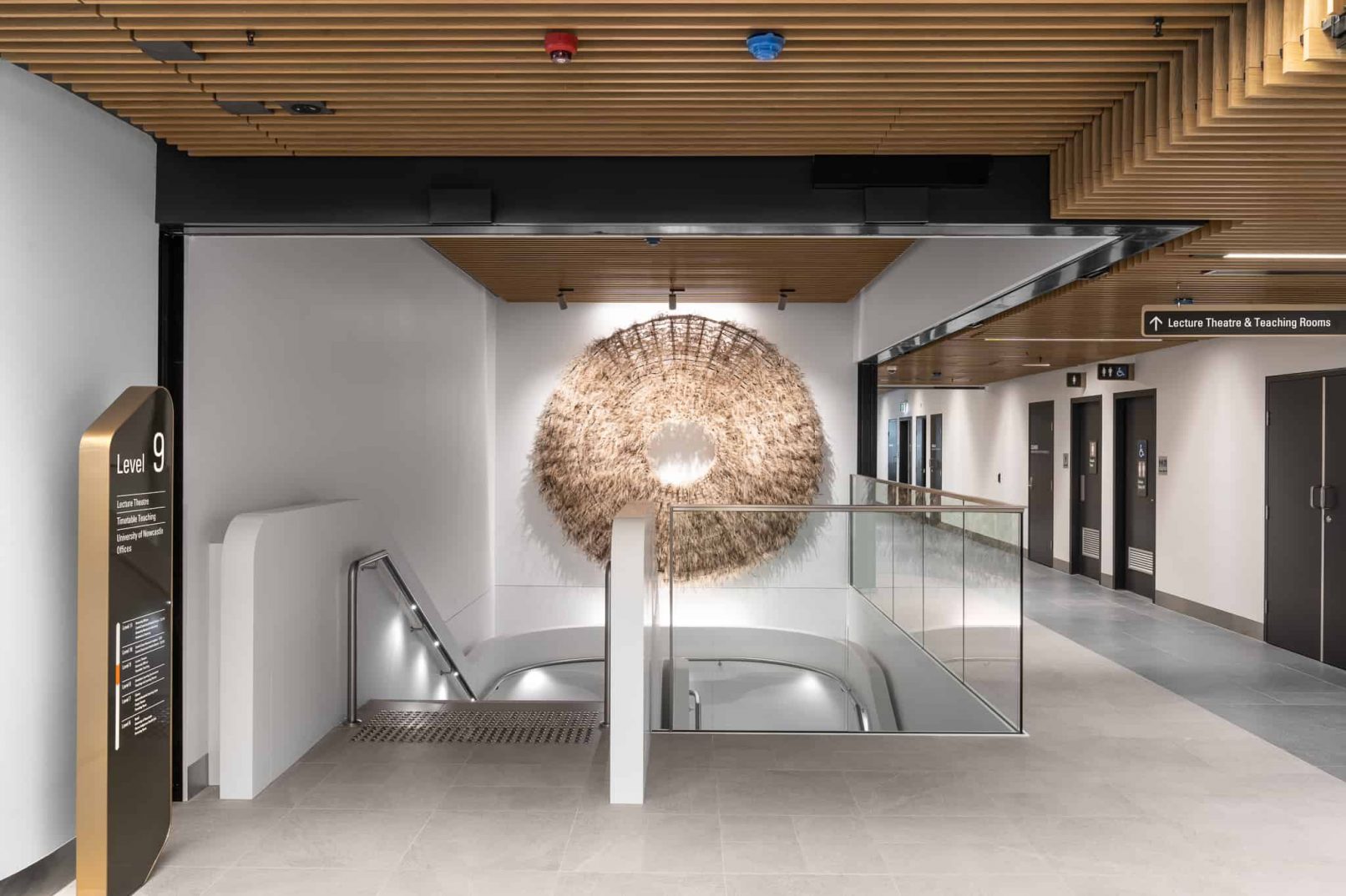 Wayfinding was developed as part of this cultural narrative, with spaces named in traditional Darkinjung language through consultation with Elders, and Indigenous-inspired artworks and installations, such as glass decals and woven motifs, used as visual cues. A holistic wayfinding system was developed including identification signage, directional signage and information totems. The materials and forms of the signs referenced the local environment and the messaging and information carefully designed to enhance the user experience of the building.