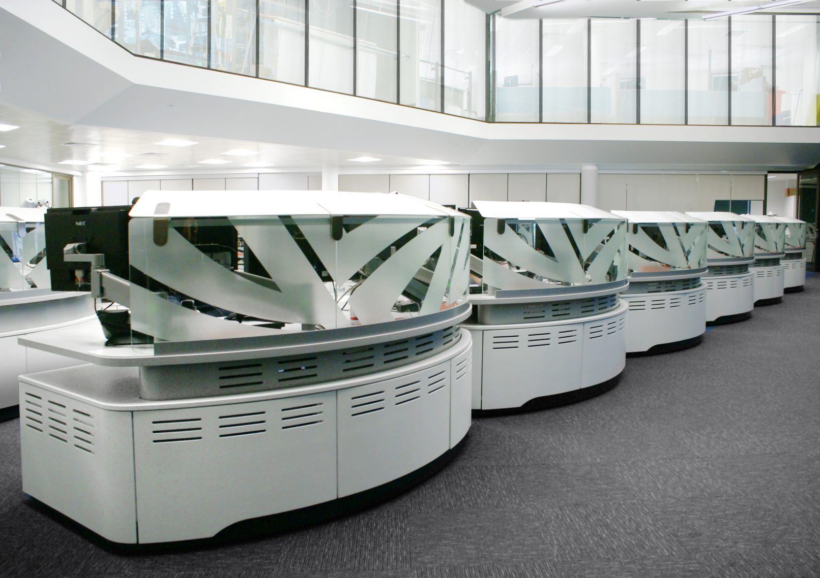 The designs also include sophisticated lighting and acoustic systems to provide maximum comfort and control for operators who undertake long and stressful shifts in front of display screens. Various design stages were undertaken to achieve the best possible layout and ergonomic intent. Workstation were prototyped and tested before installation of the final units at the control centre.